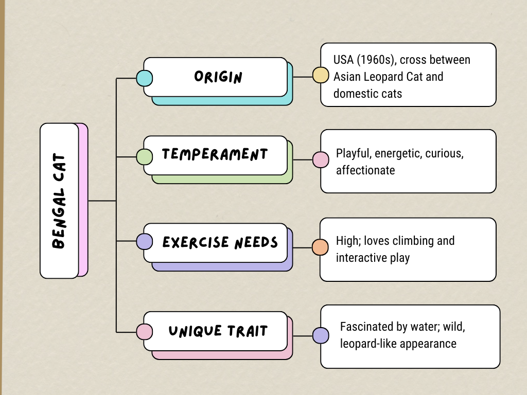 - Colors and Patterns: Bengal cats come in a variety of colors, including brown, snow, and silver. The most common pattern is spotted or marbled fur, making every Bengal cat unique.