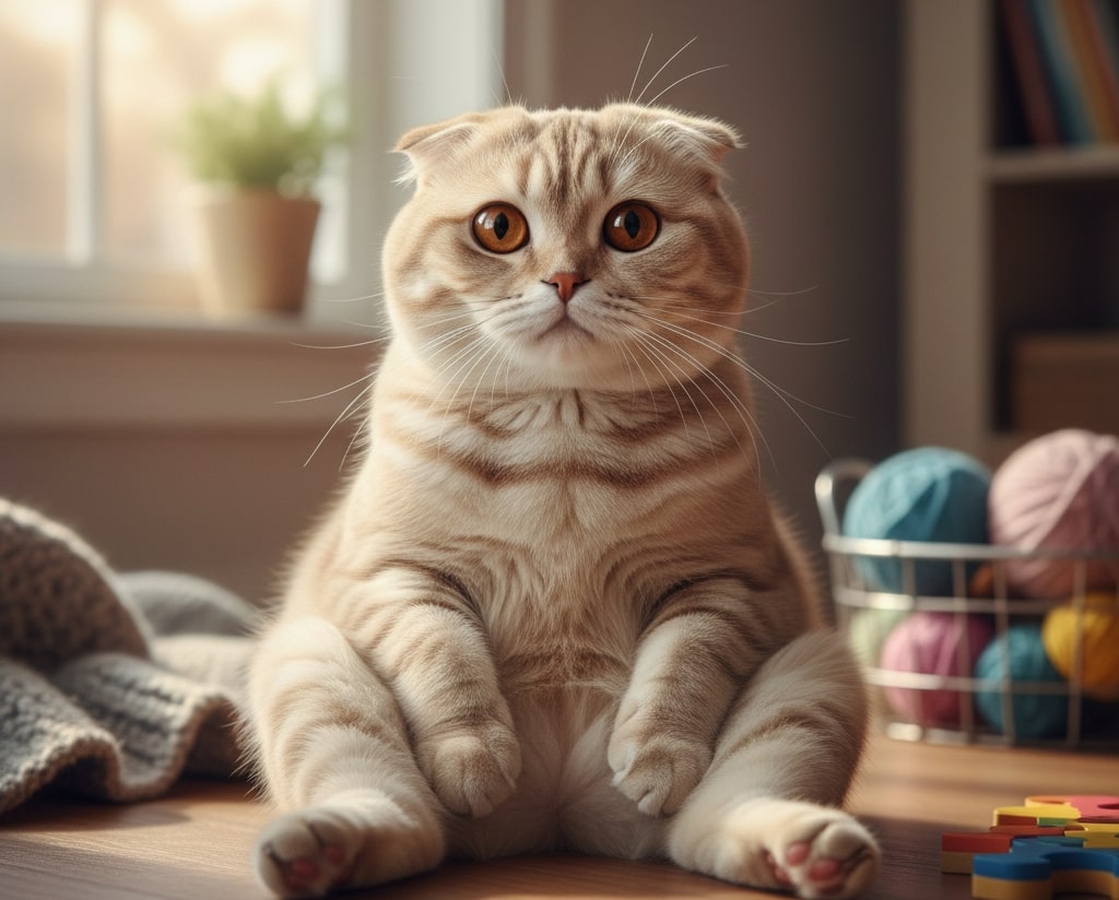 Scottish Folds are famous for the “Buddha Pose,” sitting on their hind legs with their front paws resting on their belly. While it looks funny, this posture helps stretch their back and relieve pressure on their hips, which can sometimes be stiff due to their cartilage genetics.